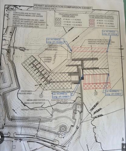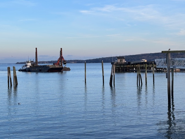 If you have not been down to Rockland Harbor recently, there's activity about: the SafeHarbors marina to the southeast of the city docks has begun dredging as part of its expansion plans, shown on the left below.